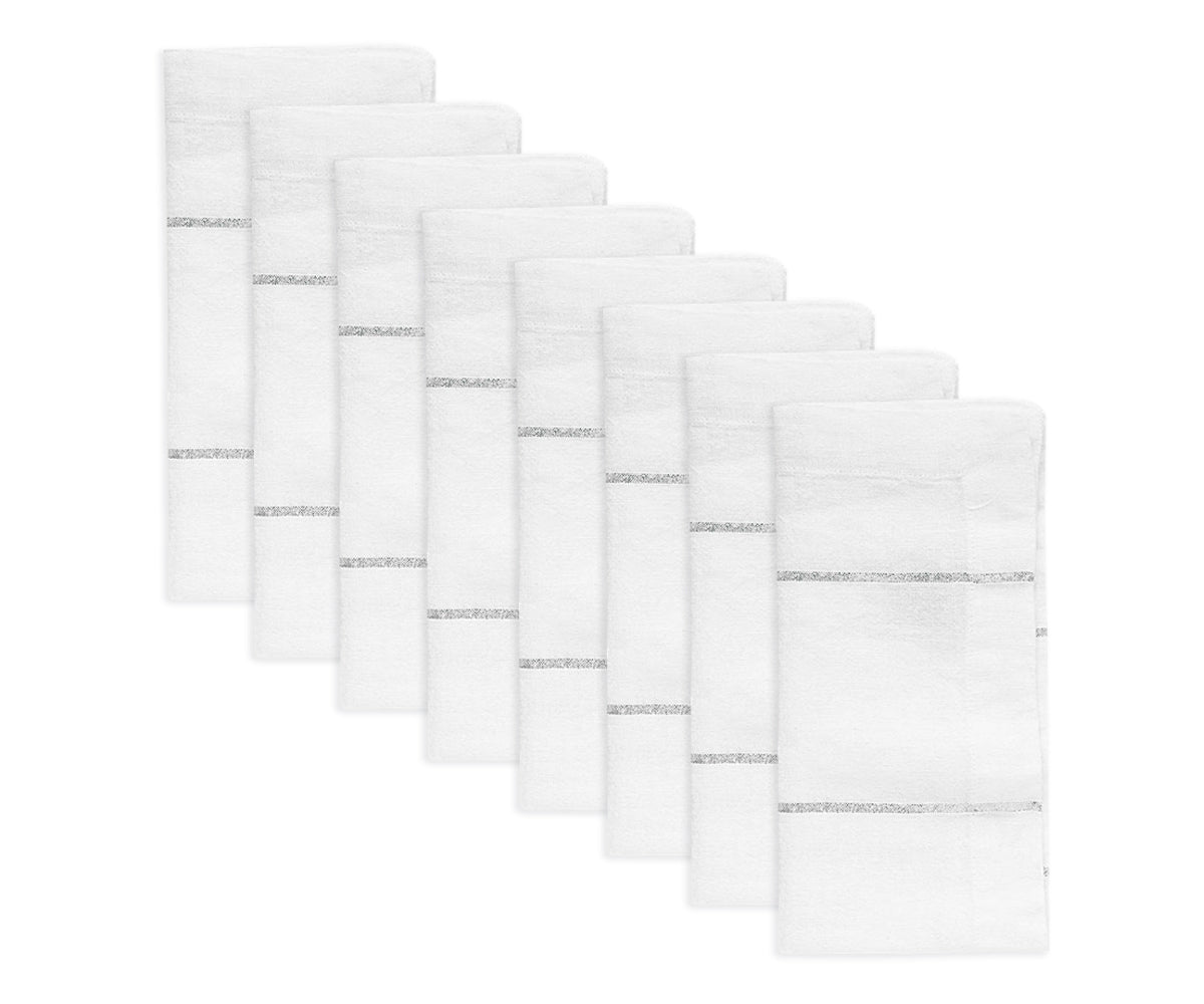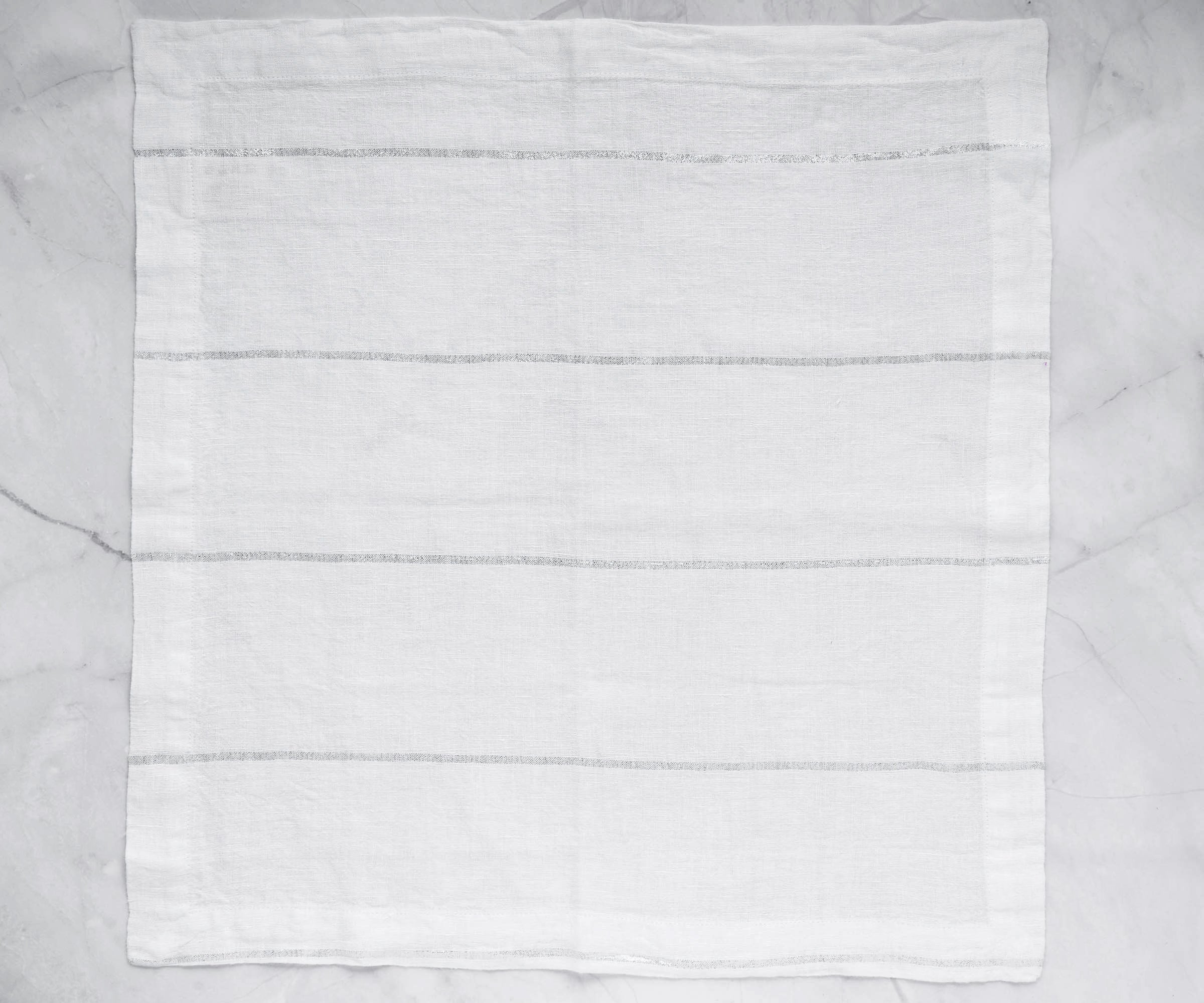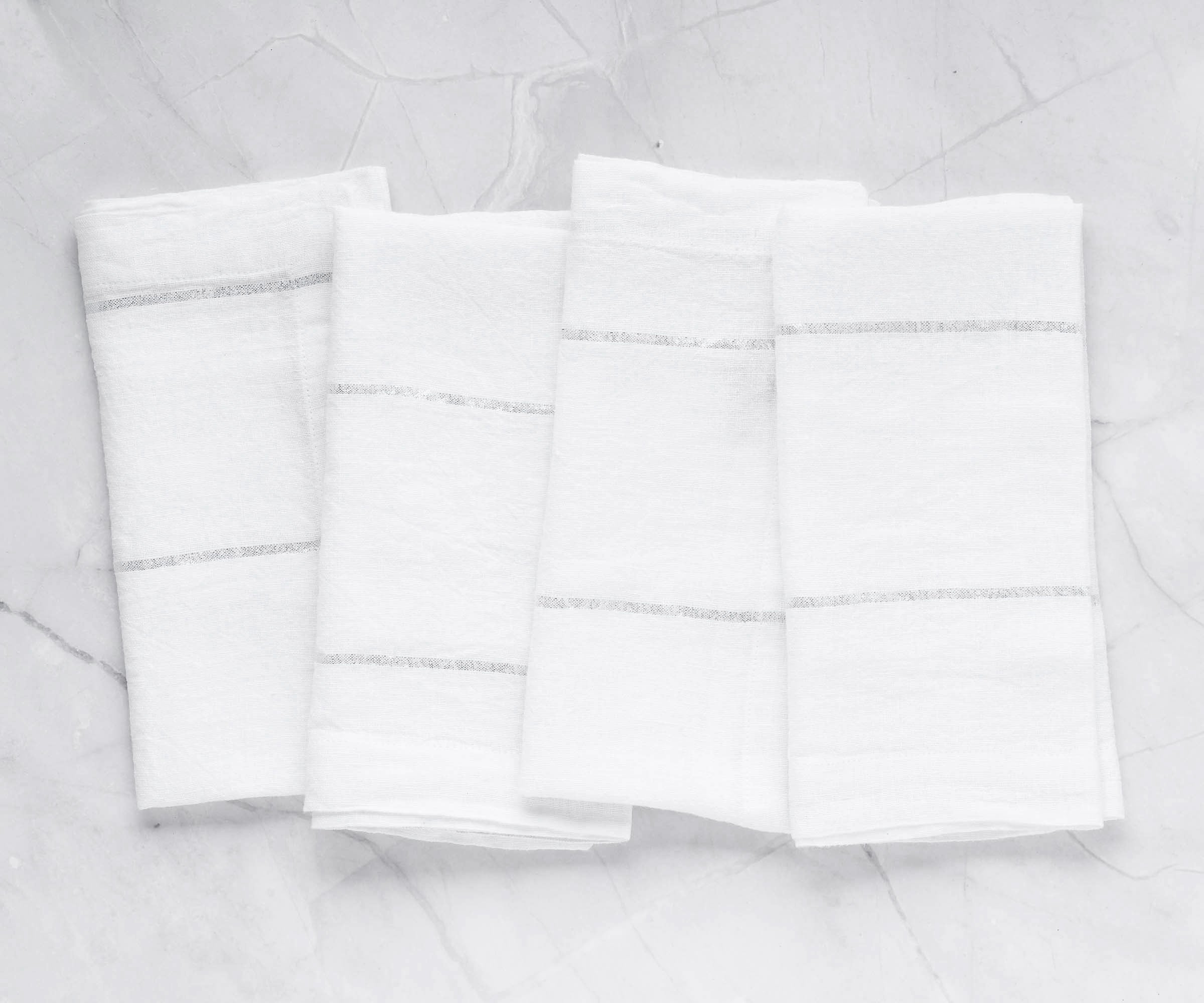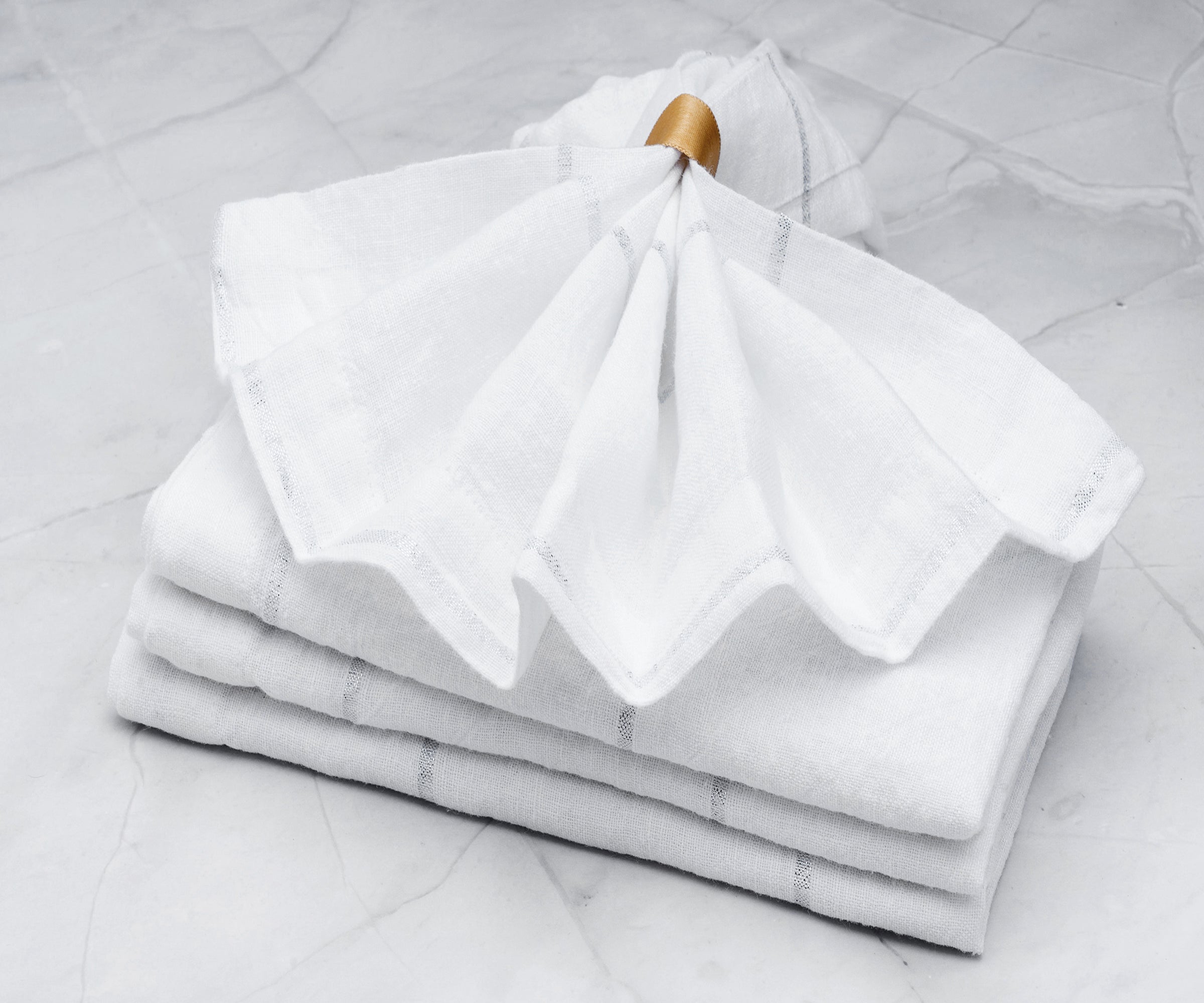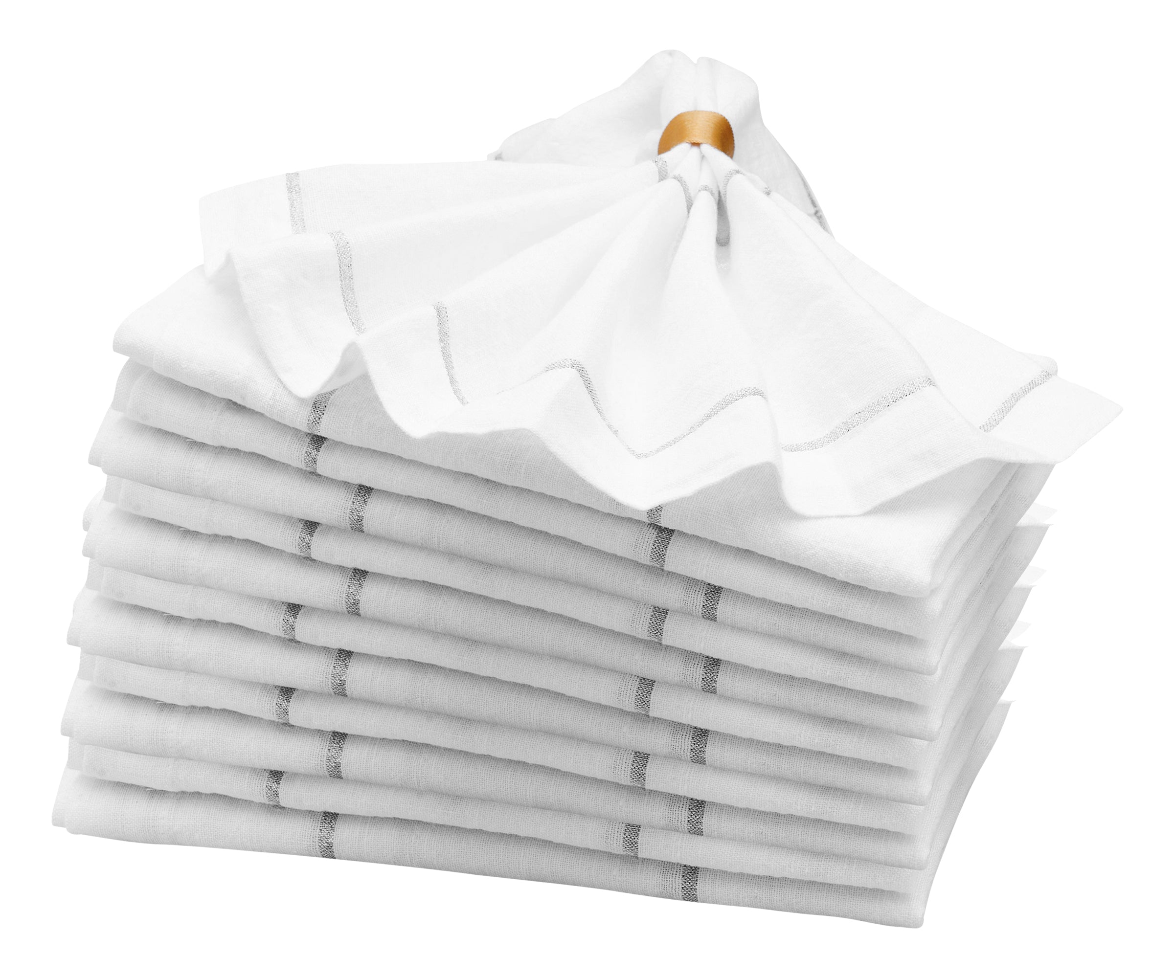 - Metallic thread napkins are the perfect addition to any table setting. Made from high-quality linen, these white napkins are soft, durable, and designed to last. They come in Sizes 4, 8, and 12 and measure 18x18 inches.