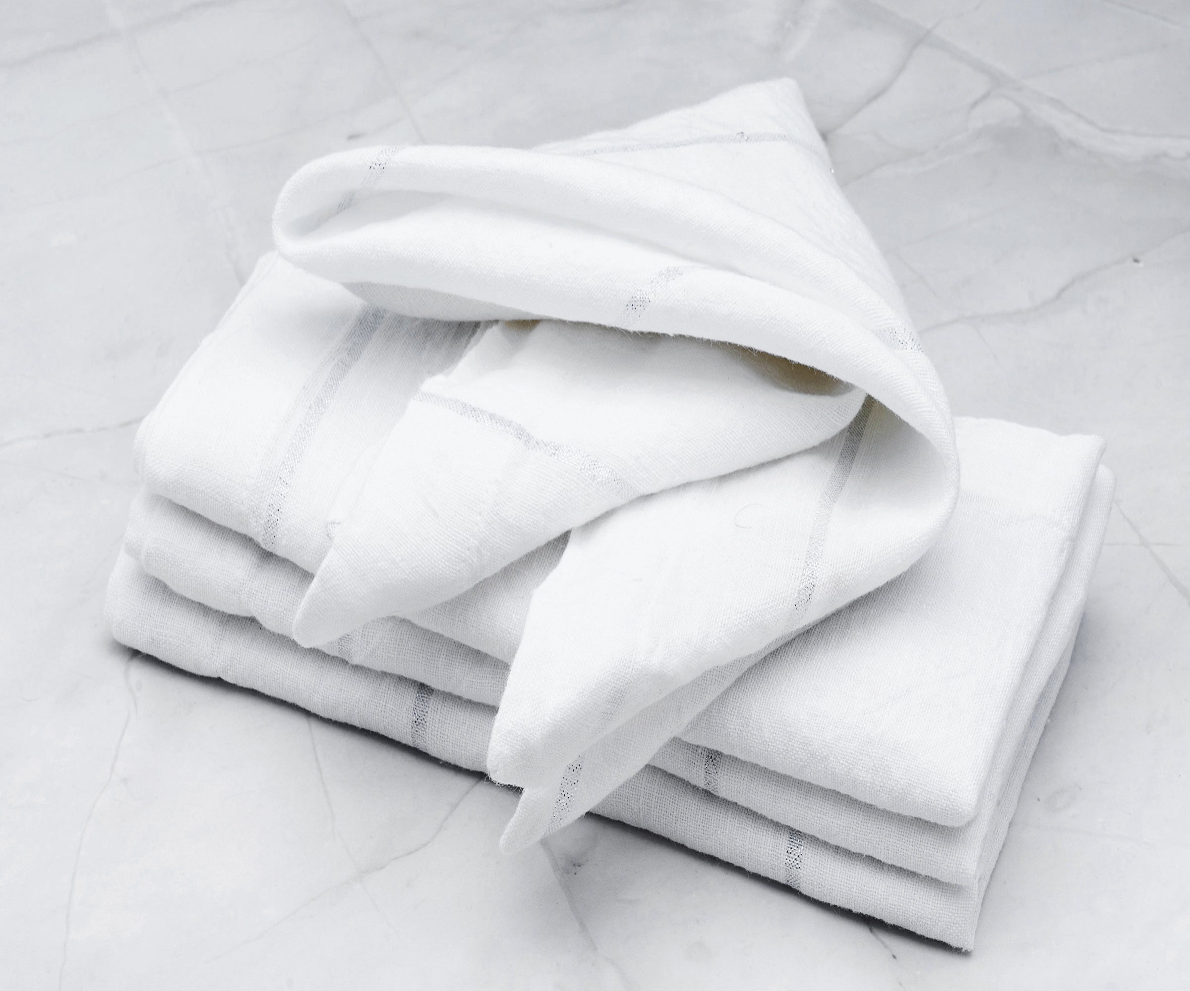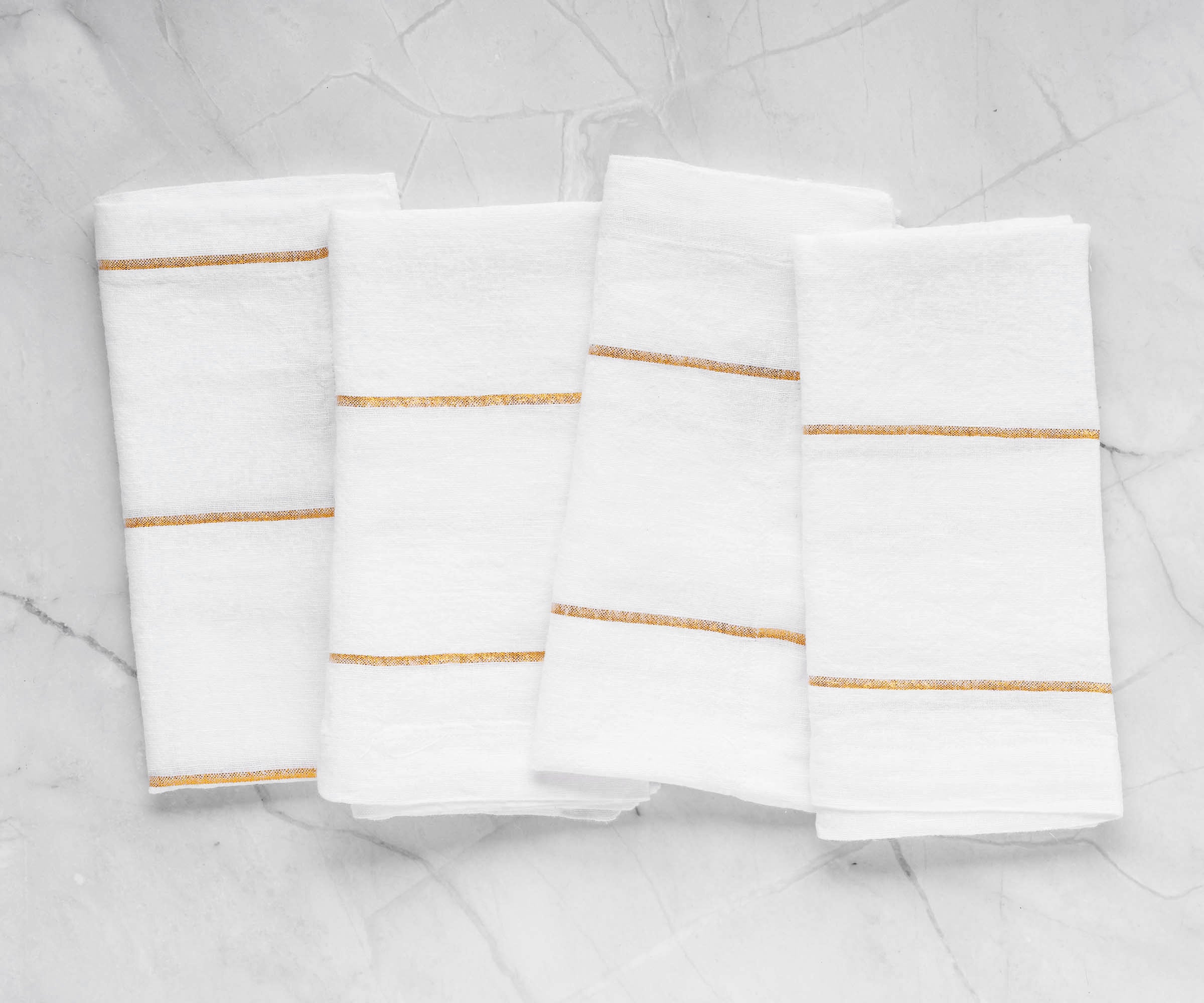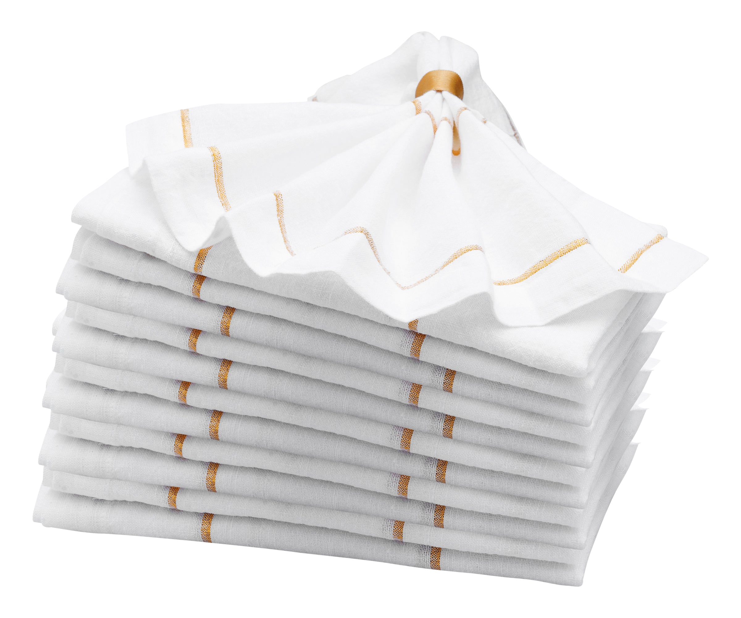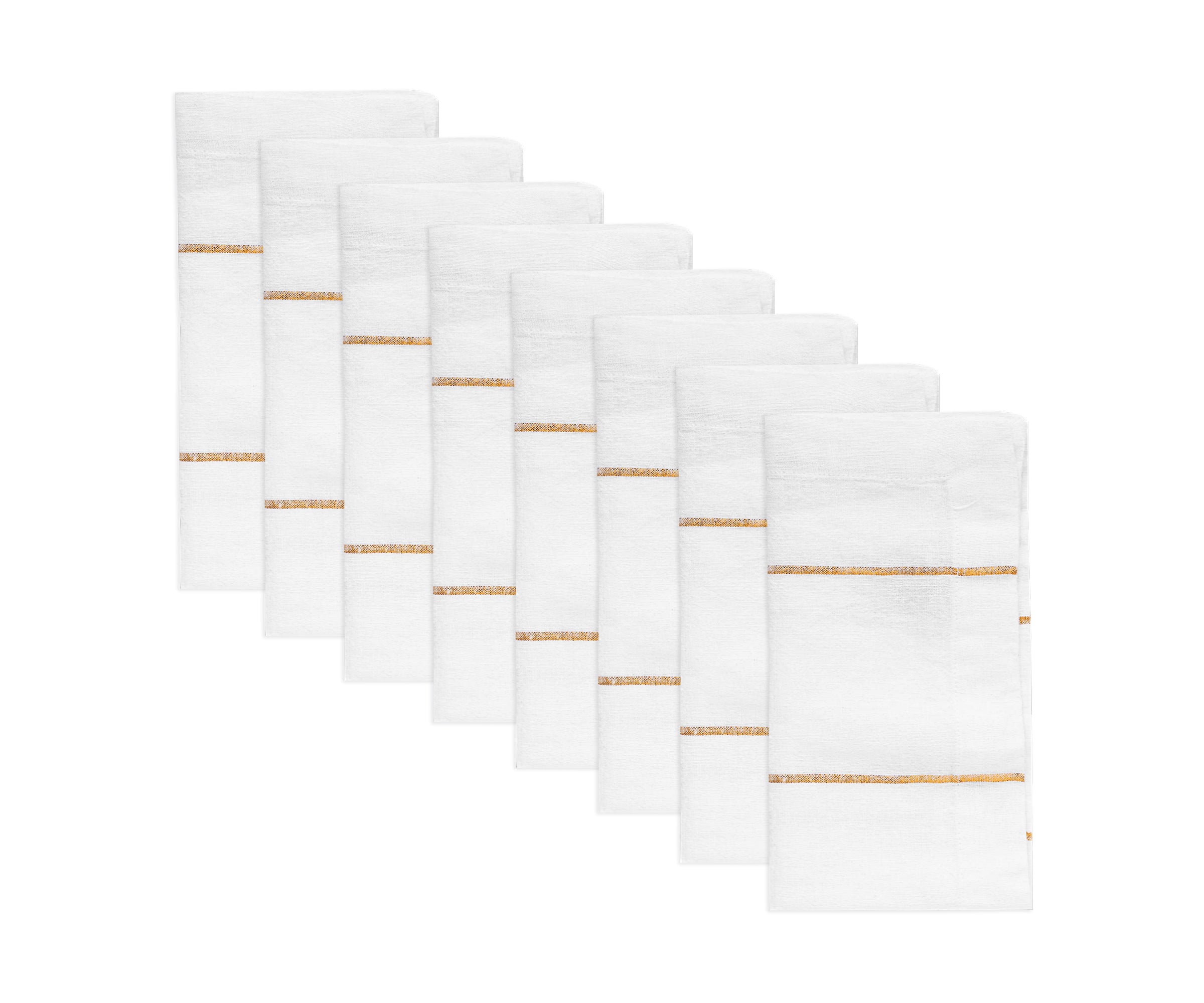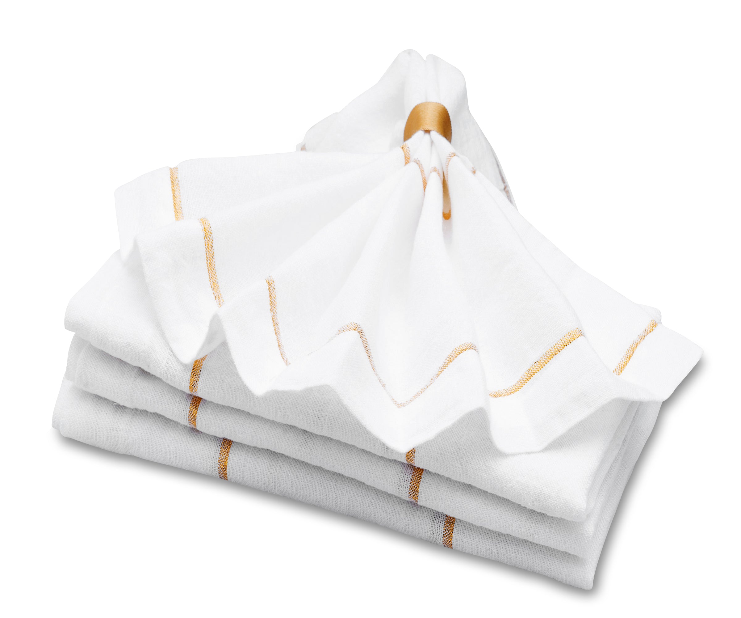 - Metallic thread napkins are the perfect addition to any table setting. Made from high-quality linen, these white napkins are soft, durable, and designed to last. They come in Sizes 4, 8, and 12 and measure 18x18 inches.