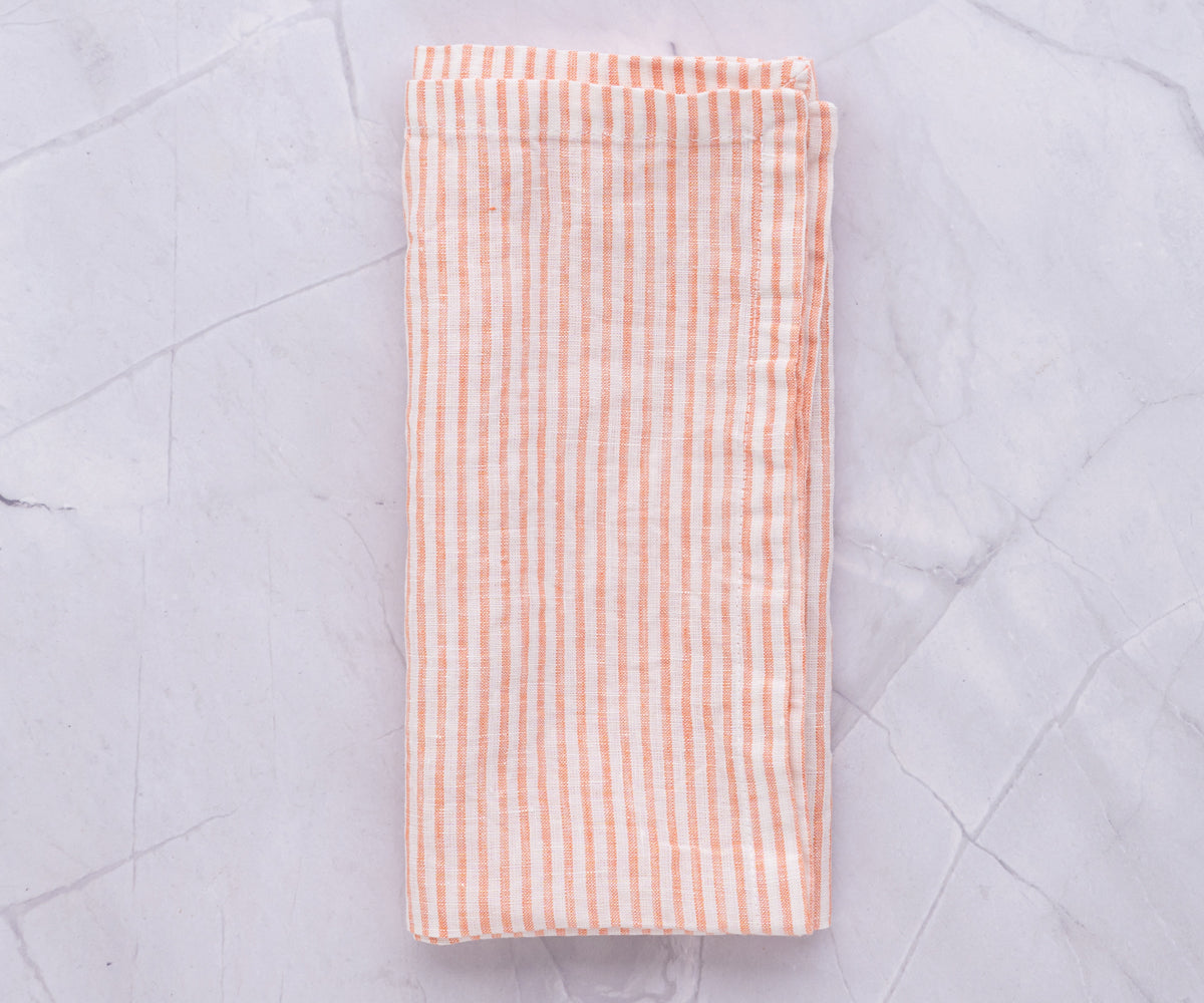 Bring warmth and elegance to your dining space with our Orange Ticking Stripe Napkins. Crafted from 100% linen, these napkins are soft, durable, and stylish. The classic ticking stripe design adds a timeless charm, making them perfect for everyday meals or special occasions.