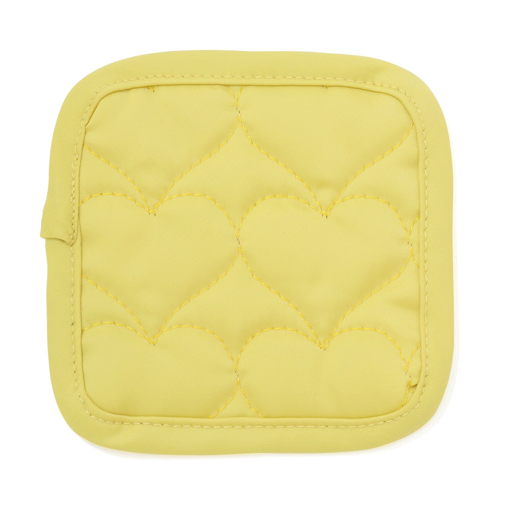 A coaster with a cute heart pattern quilted fabric.