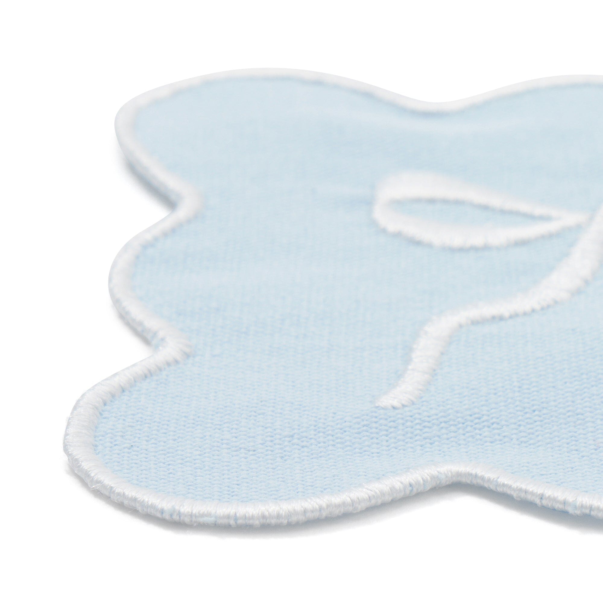A coaster in the shape of a scallop with ribbon embroidery.